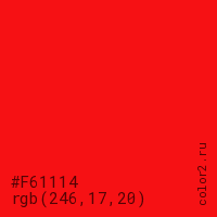 Цвет #F61114 в цветовой модели RGB обозначается тремя октетами (246, 17, 20) в десятичном формате и #F61114 в шестнадцатиричном (hex) формате, которые являются интенсивностью красного 246 (hex F6), интенсивность зелёного 17 (hex 11) и интенсивность синего 20 (hex 14).