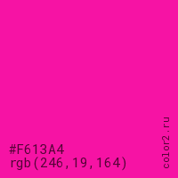 Цвет #F613A4 в цветовой модели RGB обозначается тремя октетами (246, 19, 164) в десятичном формате и #F613A4 в шестнадцатиричном (hex) формате, которые являются интенсивностью красного 246 (hex F6), интенсивность зелёного 19 (hex 13) и интенсивность синего 164 (hex A4).