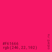 Цвет #F61666 в цветовой модели RGB обозначается тремя октетами (246, 22, 102) в десятичном формате и #F61666 в шестнадцатиричном (hex) формате, которые являются интенсивностью красного 246 (hex F6), интенсивность зелёного 22 (hex 16) и интенсивность синего 102 (hex 66).