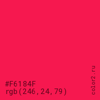 Цвет #F6184F в цветовой модели RGB обозначается тремя октетами (246, 24, 79) в десятичном формате и #F6184F в шестнадцатиричном (hex) формате, которые являются интенсивностью красного 246 (hex F6), интенсивность зелёного 24 (hex 18) и интенсивность синего 79 (hex 4F).