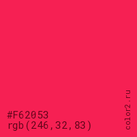 Цвет #F62053 в цветовой модели RGB обозначается тремя октетами (246, 32, 83) в десятичном формате и #F62053 в шестнадцатиричном (hex) формате, которые являются интенсивностью красного 246 (hex F6), интенсивность зелёного 32 (hex 20) и интенсивность синего 83 (hex 53).