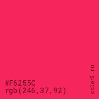 Цвет #F6255C в цветовой модели RGB обозначается тремя октетами (246, 37, 92) в десятичном формате и #F6255C в шестнадцатиричном (hex) формате, которые являются интенсивностью красного 246 (hex F6), интенсивность зелёного 37 (hex 25) и интенсивность синего 92 (hex 5C).