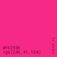 Цвет #F62986 в цветовой модели RGB обозначается тремя октетами (246, 41, 134) в десятичном формате и #F62986 в шестнадцатиричном (hex) формате, которые являются интенсивностью красного 246 (hex F6), интенсивность зелёного 41 (hex 29) и интенсивность синего 134 (hex 86).