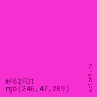 Цвет #F62FD1 в цветовой модели RGB обозначается тремя октетами (246, 47, 209) в десятичном формате и #F62FD1 в шестнадцатиричном (hex) формате, которые являются интенсивностью красного 246 (hex F6), интенсивность зелёного 47 (hex 2F) и интенсивность синего 209 (hex D1).