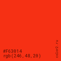 Цвет #F63014 в цветовой модели RGB обозначается тремя октетами (246, 48, 20) в десятичном формате и #F63014 в шестнадцатиричном (hex) формате, которые являются интенсивностью красного 246 (hex F6), интенсивность зелёного 48 (hex 30) и интенсивность синего 20 (hex 14).