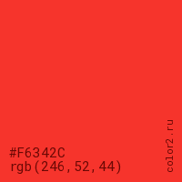 Цвет #F6342C в цветовой модели RGB обозначается тремя октетами (246, 52, 44) в десятичном формате и #F6342C в шестнадцатиричном (hex) формате, которые являются интенсивностью красного 246 (hex F6), интенсивность зелёного 52 (hex 34) и интенсивность синего 44 (hex 2C).