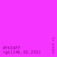 Цвет #F634FF в цветовой модели RGB обозначается тремя октетами (246, 52, 255) в десятичном формате и #F634FF в шестнадцатиричном (hex) формате, которые являются интенсивностью красного 246 (hex F6), интенсивность зелёного 52 (hex 34) и интенсивность синего 255 (hex FF).