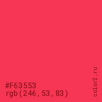 Цвет #F63553 в цветовой модели RGB обозначается тремя октетами (246, 53, 83) в десятичном формате и #F63553 в шестнадцатиричном (hex) формате, которые являются интенсивностью красного 246 (hex F6), интенсивность зелёного 53 (hex 35) и интенсивность синего 83 (hex 53).