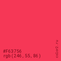 Цвет #F63756 в цветовой модели RGB обозначается тремя октетами (246, 55, 86) в десятичном формате и #F63756 в шестнадцатиричном (hex) формате, которые являются интенсивностью красного 246 (hex F6), интенсивность зелёного 55 (hex 37) и интенсивность синего 86 (hex 56).
