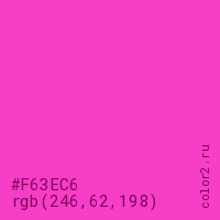 Цвет #F63EC6 в цветовой модели RGB обозначается тремя октетами (246, 62, 198) в десятичном формате и #F63EC6 в шестнадцатиричном (hex) формате, которые являются интенсивностью красного 246 (hex F6), интенсивность зелёного 62 (hex 3E) и интенсивность синего 198 (hex C6).