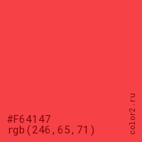Цвет #F64147 в цветовой модели RGB обозначается тремя октетами (246, 65, 71) в десятичном формате и #F64147 в шестнадцатиричном (hex) формате, которые являются интенсивностью красного 246 (hex F6), интенсивность зелёного 65 (hex 41) и интенсивность синего 71 (hex 47).