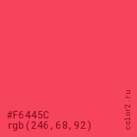 Цвет #F6445C в цветовой модели RGB обозначается тремя октетами (246, 68, 92) в десятичном формате и #F6445C в шестнадцатиричном (hex) формате, которые являются интенсивностью красного 246 (hex F6), интенсивность зелёного 68 (hex 44) и интенсивность синего 92 (hex 5C).