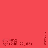 Цвет #F64852 в цветовой модели RGB обозначается тремя октетами (246, 72, 82) в десятичном формате и #F64852 в шестнадцатиричном (hex) формате, которые являются интенсивностью красного 246 (hex F6), интенсивность зелёного 72 (hex 48) и интенсивность синего 82 (hex 52).