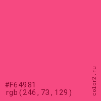 Цвет #F64981 в цветовой модели RGB обозначается тремя октетами (246, 73, 129) в десятичном формате и #F64981 в шестнадцатиричном (hex) формате, которые являются интенсивностью красного 246 (hex F6), интенсивность зелёного 73 (hex 49) и интенсивность синего 129 (hex 81).