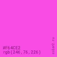 Цвет #F64CE2 в цветовой модели RGB обозначается тремя октетами (246, 76, 226) в десятичном формате и #F64CE2 в шестнадцатиричном (hex) формате, которые являются интенсивностью красного 246 (hex F6), интенсивность зелёного 76 (hex 4C) и интенсивность синего 226 (hex E2).