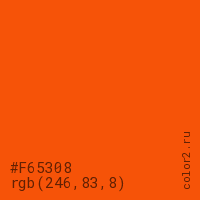 Цвет #F65308 в цветовой модели RGB обозначается тремя октетами (246, 83, 8) в десятичном формате и #F65308 в шестнадцатиричном (hex) формате, которые являются интенсивностью красного 246 (hex F6), интенсивность зелёного 83 (hex 53) и интенсивность синего 8 (hex 08).