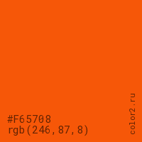 Цвет #F65708 в цветовой модели RGB обозначается тремя октетами (246, 87, 8) в десятичном формате и #F65708 в шестнадцатиричном (hex) формате, которые являются интенсивностью красного 246 (hex F6), интенсивность зелёного 87 (hex 57) и интенсивность синего 8 (hex 08).