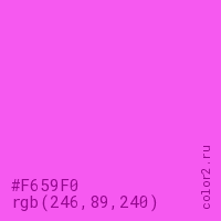 Цвет #F659F0 в цветовой модели RGB обозначается тремя октетами (246, 89, 240) в десятичном формате и #F659F0 в шестнадцатиричном (hex) формате, которые являются интенсивностью красного 246 (hex F6), интенсивность зелёного 89 (hex 59) и интенсивность синего 240 (hex F0).