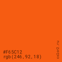 Цвет #F65C12 в цветовой модели RGB обозначается тремя октетами (246, 92, 18) в десятичном формате и #F65C12 в шестнадцатиричном (hex) формате, которые являются интенсивностью красного 246 (hex F6), интенсивность зелёного 92 (hex 5C) и интенсивность синего 18 (hex 12).
