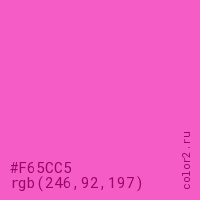 Цвет #F65CC5 в цветовой модели RGB обозначается тремя октетами (246, 92, 197) в десятичном формате и #F65CC5 в шестнадцатиричном (hex) формате, которые являются интенсивностью красного 246 (hex F6), интенсивность зелёного 92 (hex 5C) и интенсивность синего 197 (hex C5).