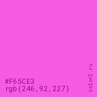 Цвет #F65CE3 в цветовой модели RGB обозначается тремя октетами (246, 92, 227) в десятичном формате и #F65CE3 в шестнадцатиричном (hex) формате, которые являются интенсивностью красного 246 (hex F6), интенсивность зелёного 92 (hex 5C) и интенсивность синего 227 (hex E3).