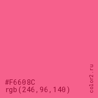 Цвет #F6608C в цветовой модели RGB обозначается тремя октетами (246, 96, 140) в десятичном формате и #F6608C в шестнадцатиричном (hex) формате, которые являются интенсивностью красного 246 (hex F6), интенсивность зелёного 96 (hex 60) и интенсивность синего 140 (hex 8C).