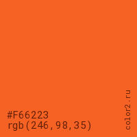 Цвет #F66223 в цветовой модели RGB обозначается тремя октетами (246, 98, 35) в десятичном формате и #F66223 в шестнадцатиричном (hex) формате, которые являются интенсивностью красного 246 (hex F6), интенсивность зелёного 98 (hex 62) и интенсивность синего 35 (hex 23).