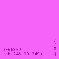 Цвет #F663F9 в цветовой модели RGB обозначается тремя октетами (246, 99, 249) в десятичном формате и #F663F9 в шестнадцатиричном (hex) формате, которые являются интенсивностью красного 246 (hex F6), интенсивность зелёного 99 (hex 63) и интенсивность синего 249 (hex F9).