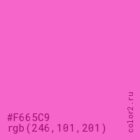 Цвет #F665C9 в цветовой модели RGB обозначается тремя октетами (246, 101, 201) в десятичном формате и #F665C9 в шестнадцатиричном (hex) формате, которые являются интенсивностью красного 246 (hex F6), интенсивность зелёного 101 (hex 65) и интенсивность синего 201 (hex C9).