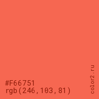 Цвет #F66751 в цветовой модели RGB обозначается тремя октетами (246, 103, 81) в десятичном формате и #F66751 в шестнадцатиричном (hex) формате, которые являются интенсивностью красного 246 (hex F6), интенсивность зелёного 103 (hex 67) и интенсивность синего 81 (hex 51).