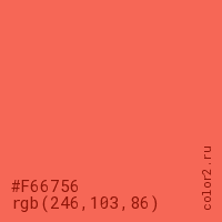 Цвет #F66756 в цветовой модели RGB обозначается тремя октетами (246, 103, 86) в десятичном формате и #F66756 в шестнадцатиричном (hex) формате, которые являются интенсивностью красного 246 (hex F6), интенсивность зелёного 103 (hex 67) и интенсивность синего 86 (hex 56).