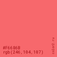 Цвет #F6686B в цветовой модели RGB обозначается тремя октетами (246, 104, 107) в десятичном формате и #F6686B в шестнадцатиричном (hex) формате, которые являются интенсивностью красного 246 (hex F6), интенсивность зелёного 104 (hex 68) и интенсивность синего 107 (hex 6B).