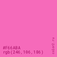 Цвет #F66ABA в цветовой модели RGB обозначается тремя октетами (246, 106, 186) в десятичном формате и #F66ABA в шестнадцатиричном (hex) формате, которые являются интенсивностью красного 246 (hex F6), интенсивность зелёного 106 (hex 6A) и интенсивность синего 186 (hex BA).