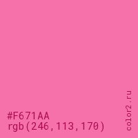 Цвет #F671AA в цветовой модели RGB обозначается тремя октетами (246, 113, 170) в десятичном формате и #F671AA в шестнадцатиричном (hex) формате, которые являются интенсивностью красного 246 (hex F6), интенсивность зелёного 113 (hex 71) и интенсивность синего 170 (hex AA).