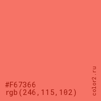 Цвет #F67366 в цветовой модели RGB обозначается тремя октетами (246, 115, 102) в десятичном формате и #F67366 в шестнадцатиричном (hex) формате, которые являются интенсивностью красного 246 (hex F6), интенсивность зелёного 115 (hex 73) и интенсивность синего 102 (hex 66).