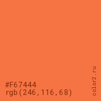 Цвет #F67444 в цветовой модели RGB обозначается тремя октетами (246, 116, 68) в десятичном формате и #F67444 в шестнадцатиричном (hex) формате, которые являются интенсивностью красного 246 (hex F6), интенсивность зелёного 116 (hex 74) и интенсивность синего 68 (hex 44).