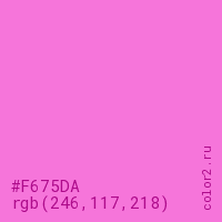 Цвет #F675DA в цветовой модели RGB обозначается тремя октетами (246, 117, 218) в десятичном формате и #F675DA в шестнадцатиричном (hex) формате, которые являются интенсивностью красного 246 (hex F6), интенсивность зелёного 117 (hex 75) и интенсивность синего 218 (hex DA).