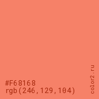 Цвет #F68168 в цветовой модели RGB обозначается тремя октетами (246, 129, 104) в десятичном формате и #F68168 в шестнадцатиричном (hex) формате, которые являются интенсивностью красного 246 (hex F6), интенсивность зелёного 129 (hex 81) и интенсивность синего 104 (hex 68).