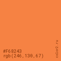 Цвет #F68243 в цветовой модели RGB обозначается тремя октетами (246, 130, 67) в десятичном формате и #F68243 в шестнадцатиричном (hex) формате, которые являются интенсивностью красного 246 (hex F6), интенсивность зелёного 130 (hex 82) и интенсивность синего 67 (hex 43).