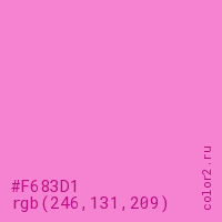 Цвет #F683D1 в цветовой модели RGB обозначается тремя октетами (246, 131, 209) в десятичном формате и #F683D1 в шестнадцатиричном (hex) формате, которые являются интенсивностью красного 246 (hex F6), интенсивность зелёного 131 (hex 83) и интенсивность синего 209 (hex D1).