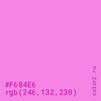 Цвет #F684E6 в цветовой модели RGB обозначается тремя октетами (246, 132, 230) в десятичном формате и #F684E6 в шестнадцатиричном (hex) формате, которые являются интенсивностью красного 246 (hex F6), интенсивность зелёного 132 (hex 84) и интенсивность синего 230 (hex E6).