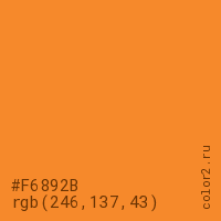 Цвет #F6892B в цветовой модели RGB обозначается тремя октетами (246, 137, 43) в десятичном формате и #F6892B в шестнадцатиричном (hex) формате, которые являются интенсивностью красного 246 (hex F6), интенсивность зелёного 137 (hex 89) и интенсивность синего 43 (hex 2B).