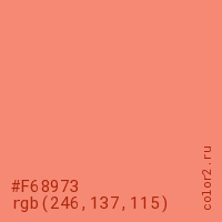 Цвет #F68973 в цветовой модели RGB обозначается тремя октетами (246, 137, 115) в десятичном формате и #F68973 в шестнадцатиричном (hex) формате, которые являются интенсивностью красного 246 (hex F6), интенсивность зелёного 137 (hex 89) и интенсивность синего 115 (hex 73).