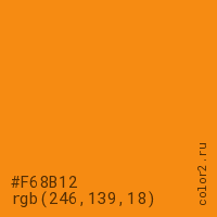 Цвет #F68B12 в цветовой модели RGB обозначается тремя октетами (246, 139, 18) в десятичном формате и #F68B12 в шестнадцатиричном (hex) формате, которые являются интенсивностью красного 246 (hex F6), интенсивность зелёного 139 (hex 8B) и интенсивность синего 18 (hex 12).