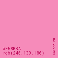 Цвет #F68BBA в цветовой модели RGB обозначается тремя октетами (246, 139, 186) в десятичном формате и #F68BBA в шестнадцатиричном (hex) формате, которые являются интенсивностью красного 246 (hex F6), интенсивность зелёного 139 (hex 8B) и интенсивность синего 186 (hex BA).