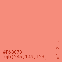 Цвет #F68C7B в цветовой модели RGB обозначается тремя октетами (246, 140, 123) в десятичном формате и #F68C7B в шестнадцатиричном (hex) формате, которые являются интенсивностью красного 246 (hex F6), интенсивность зелёного 140 (hex 8C) и интенсивность синего 123 (hex 7B).