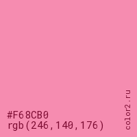 Цвет #F68CB0 в цветовой модели RGB обозначается тремя октетами (246, 140, 176) в десятичном формате и #F68CB0 в шестнадцатиричном (hex) формате, которые являются интенсивностью красного 246 (hex F6), интенсивность зелёного 140 (hex 8C) и интенсивность синего 176 (hex B0).