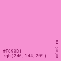 Цвет #F690D1 в цветовой модели RGB обозначается тремя октетами (246, 144, 209) в десятичном формате и #F690D1 в шестнадцатиричном (hex) формате, которые являются интенсивностью красного 246 (hex F6), интенсивность зелёного 144 (hex 90) и интенсивность синего 209 (hex D1).