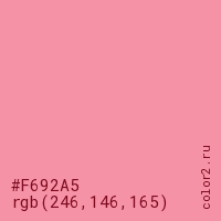 Цвет #F692A5 в цветовой модели RGB обозначается тремя октетами (246, 146, 165) в десятичном формате и #F692A5 в шестнадцатиричном (hex) формате, которые являются интенсивностью красного 246 (hex F6), интенсивность зелёного 146 (hex 92) и интенсивность синего 165 (hex A5).