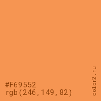 Цвет #F69552 в цветовой модели RGB обозначается тремя октетами (246, 149, 82) в десятичном формате и #F69552 в шестнадцатиричном (hex) формате, которые являются интенсивностью красного 246 (hex F6), интенсивность зелёного 149 (hex 95) и интенсивность синего 82 (hex 52).